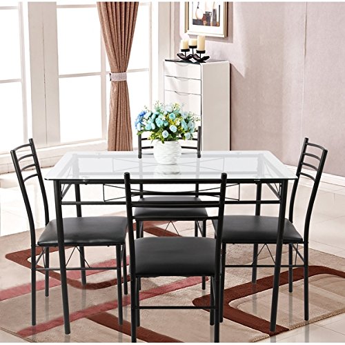 5-piece Glass Dining Table Set, Glass Table and 4 Chair Sets Metal Kitchen Room Furniture (Black)