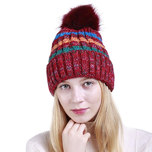 Rmalby Unisex Color Block Knit Wool Beanie Cosy Winter Warm Bobble Ski Pom Pom Hat Cap (Red)